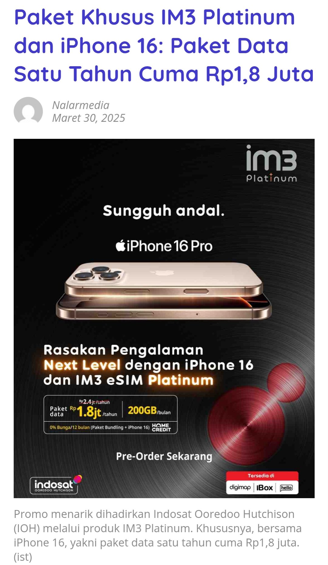 Paket Khusus IM3 Platinum dan iPhone 16: Paket Data Satu Tahun Cuma Rp1,8 Juta